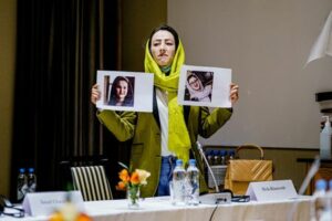 La representante de la sociedad civil afgana, Heda Khamoush, muestra fotos de activistas por los derechos de las mujeres detenidas recientemente en Afganistán, durante una reunión en el hotel Soria Moria, donde la sociedad civil y los talibanes afganos fueron invitados a dialogar, en Oslo, Noruega, 24 de enero de 2022 NTB/Stian Lysberg Solum via REUTERS/
