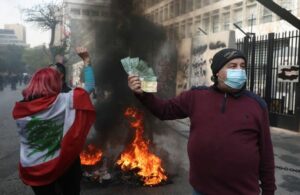 A demonstrator holds Lebanese pound banknotes during a protest organized by Depositors’ Outcry, a group campaigning for angry depositors outside Lebanon’s Central Bank building in Beirut, Lebanon January 25, 2023. REUTERS/Mohamed Azakir