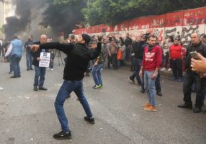 A demonstrator throws a stone during a protest organized by Depositors’ Outcry, a group campaigning for angry depositors outside Lebanon’s Central Bank building in Beirut, Lebanon January 25, 2023. REUTERS/Mohamed Azakir