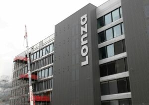 FILE PHOTO: A logo is pictured on the Ibex building of Lonza, where the Moderna mRNA coronavirus disease (COVID-19) vaccine will be produced, in Visp, Switzerland, September 29, 2020. REUTERS/Denis Balibouse/File Photo