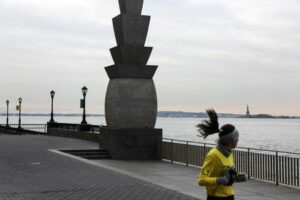 FILE PHOTO: The Statue of Liberty stands Liberty Island in New York Harbor as a woman jogs by in New York City, U.S., January 11, 2023. REUTERS/Shannon Stapleton