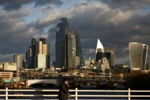 FILE PHOTO: A person walks across Waterloo Bridge with the City of London financial district in the background, in London, Britain, January 13, 2023. REUTERS/Henry Nicholls/File Photo