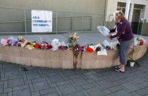 Half Moon Bay resident Elisabeth Olander, 68, places flowers at a memorial for shooting victims at Mac Dutra Park in Half Moon Bay, California, U.S., January 25, 2023. REUTERS/Fred Greaves