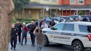 Police officers detain a man, believed by law enforcement to be the Half Moon Bay mass shooting suspect, in Half Moon Bay, California, U.S., January 23, 2023, in this screengrab taken from a social media video. Kati McHugh via REUTERS