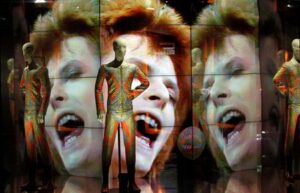 FILE PHOTO: Two suits designed by Freddie Burretti (1972) for the Ziggy Stardust tour are displayed in front of a video showing pop star David Bowie singing at the BBC show Top of the Pops (July 1972) as part of the exhibition “David Bowie Is” at the Paris Philharmonic Hall “Philharmonie de Paris” February 27, 2015. REUTERS/Charles Platiau/File Photo