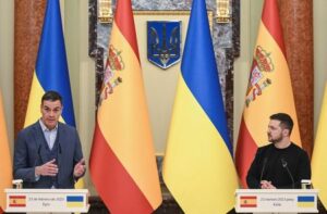 El presidente de Ucrania, Volodímir Zelenski, y el presidente del Gobierno español, Pedro Sánchez, asisten a una rueda de prensa conjunta, en medio del ataque de Rusia a Ucrania, en Kiev, Ucrania. 23 de febrero de 2023. REUTERS/Viacheslav Ratynskyi