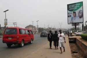 People walk past a campaign billboard of All Progressives Congress (APC) Presidential candidate, Bola Tinubu, ahead of Nigeria’s Presidential election in Awka, Anambra state, Nigeria February 23, 2023. REUTERS/Temilade Adelaja