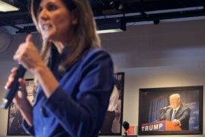 FILE PHOTO: A photograph of former U.S. President Donald Trump hangs on the wall as Republican presidential candidate and former U.S. Ambassador to the United Nations Nikki Haley speaks during a campaign town hall meeting at the Institute of Politics at St. Anselm College in Manchester, New Hampshire, U.S., February 17, 2023. REUTERS/Brian Snyder