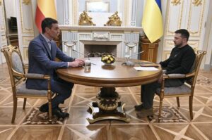 Ukraine’s President Volodymyr Zelenskiy and Spain’s Prime Minister Pedro Sanchez talk during a meeting, amid Russia’s attack on Ukraine, in Kyiv, Ukraine February 23, 2023. Moncloa Palace/Borja Puig de la Bellacasa/Handout via REUTERS
