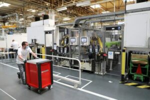 FILE PHOTO: An employee wearing a protective face mask pushes a toolbox on wheels at a factory of manufacturer Valeo in Etaples near Le Touquet, France May 26, 2020. Ludovic Marin/Pool via REUTERS