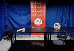FILE PHOTO: A view of an empty media centre at the centre-left Democratic Party (PD) election night headquarters in Rome, Italy, September 26, 2022. REUTERS/Remo Casilli
