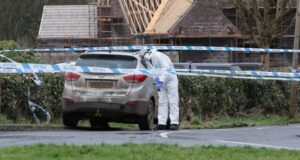 A forensic officer from Police Service of Northern Ireland (PSNI) works at the scene of the Youth Sport Omagh sports complex on Killyclogher Road area, where off-duty PSNI Detective Chief Inspector John Caldwell was shot, in Omagh, Northern Ireland February 23, 2023. REUTERS/Lorraine O’Sullivan
