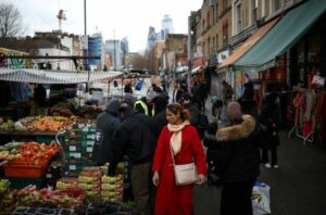 FILE PHOTO: People browse stalls at a street market in February 24, 2023 February 24, 2023 FILE PHOTO: People browse stalls at a street market in east London, Britain, February 4, 2023. REUTERS/Henry Nicholls