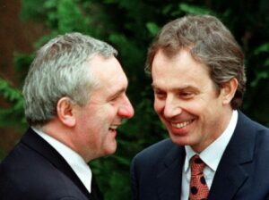FILE PHOTO: Prime Minister Tony Blair (R) embraces Irish Prime Minister Bertie Ahern after all parties reached a historic peace agreement April 10, 1998. The accord stated that the people of Northern Ireland will decide democratically their own future./File Photo