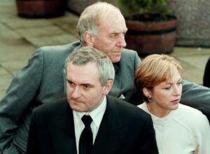FILE PHOTO: Irish Taioseach Bertie Ahern (front) returns to Castle Buildings April 8, 1998, after attending his mother’s funeral to be greeted by Irish foreign minister David Andrews (back) and his deputy Liz O’Donnell on the penultimate day of peace talks./File Photo