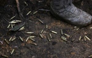 Spent shell casing lie on the ground as Ukrainian service members from 28th mechanised brigade engage in firefights at the frontline, amid Russia?s attack on Ukraine in the region of Bakhmut, Ukraine, April 5, 2023. REUTERS/Kai Pfaffenbach