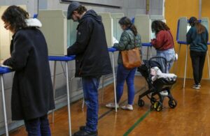 Stacey Dickert votes with her baby Quinn, 8 months, at Maryland Avenue Montessori School during Wisconsin’s Supreme Court election in Milwaukee, Wisconsin, U.S., April 4, 2023. REUTERS/Evelyn Hockstein