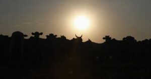 FOTO DE ARCHIVO: Silueta de ganado en un comederode la