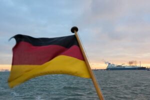 FILE PHOTO: A German national flag flies during the arrival of the Floating Storage Regasification Unit (FSRU) ship “Hoegh Esperanza” at the port of Wilhelmshaven, Germany, December 15, 2022. REUTERS/Fabian Bimmer/Pool/File Photo