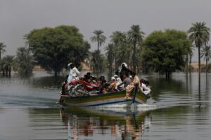 FOTO DE ARCHIVO: Víctimas de las inundaciones viajan en un bote, tras las lluvias e inundaciones durante la temporada del monzón en la ciudad de Talti en Sehwan, Pakistán. 15 de septiembre, 2022. REUTERS/Akhtar Soomro