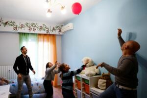 Cristiano Giraldi, 44 and Giorgio Duca, 40, play with their children Ginevra and Emanuele, before an interview with Reuters, in Rome, Italy March 29, 2023. REUTERS/Yara Nardi