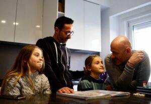 Cristiano Giraldi, 44 and Giorgio Duca, 40, speak with their children Ginevra and Emanuele during an interview with Reuters, in Rome, Italy March 29, 2023. REUTERS/Yara Nardi
