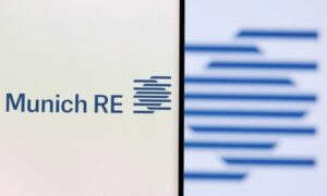 FILE PHOTO: Munich Re Group logo is seen on a smartphone in front of displayed same logo in this illustration taken, December 1, 2021. REUTERS/Dado Ruvic/Illustration