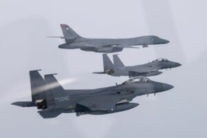 A U.S. Air Force B-1B bomber (top) and South Korean Air Force F-15K fighter jets take part in a joint air drill in South Korea, March 3, 2023. The South Korean Defence Ministry/Handout via REUTERS
