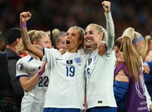Soccer Football – Women’s Finalissima – England v Brazil – Wembley Stadium, London, Britain – April 6, 2023 England’s Rachel Daly and England’s Alex Greenwood celebrates after winning the Women’s Finalissima REUTERS/Molly Darlington