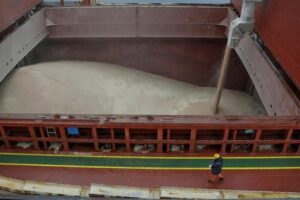 FOTO DE ARCHIVO: Un miembro de la tripulación del granelero de bandera liberiana Valsamitis vigila la carga de trigo para Kenia y Etiopía, en medio del ataque de Rusia a Ucrania, en un puerto marítimo de la ciudad de Chornomorsk, Ucrania. 18 de febrero, 2023. REUTERS/Nina Liashonok