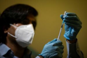 FILE PHOTO: First of two injections of the Pfizer-BioNTech COVID-19 vaccine is drawn into a syringe at the Hurley Clinic in London, Britain December 14, 2020. Aaron Chown/PA Wire/Pool via REUTERS