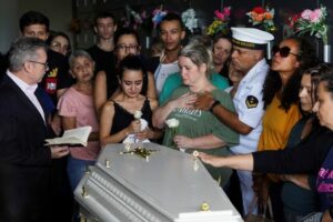 Parents stands alongside the coffin, that contains the remains of their 5-year-old, Bernardo Cunha Machado, who was killed by a man inside a daycare center, during a wake at the Sao Jose cemetery, in Blumenau, Santa Catarina, Brazil April 6, 2023. REUTERS/Vinicius Bretzke