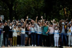 Students wave as French President Emmanuel Macron arrives to attend a visit at Sun Yat-sen University in Guangzhou, China, April 7, 2023. REUTERS/Gonzalo Fuentes/Pool