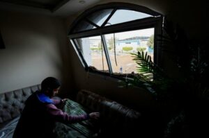 Un niño comprueba los daños en el interior de un edificio tras los ataques aéreos israelíes, en la ciudad de Gaza. 7 de abril de 2023. REUTERS/Mohammed Salem
