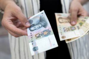 FILE PHOTO: Woman holds Chinese Yuan banknotes in this illustration taken May 30, 2022. REUTERS/Dado Ruvic/Illustration