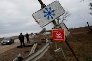 FILE PHOTO: A mine danger sign is pictured on a pole by the main road to Kherson, Ukraine November 16, 2022. REUTERS/Murad Sezer