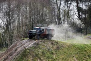 A Bastion 4×4 armored personnel carrier vehicle is pictured on the test track at the Arquus military vehicle production plant, a unit of Volvo AB, in Limoges, France, April 6, 2023. REUTERS/Benoit Tessier