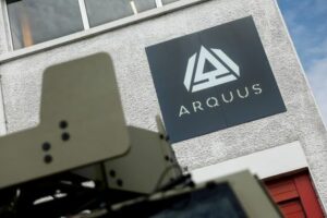 The logo of Arquus, a unit of Volvo AB, is pictured at the production plant in Limoges, France, April 6, 2023. REUTERS/Benoit Tessier