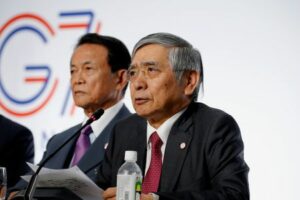 FOTO DE ARCHIVO. El entonces ministro de Finanzas japonés, Taro Aso, y el gobernador del Banco de Japón, Haruhiko Kuroda, hablan durante una rueda de prensa en la reunión de ministros de Finanzas y gobernadores de bancos centrales del G7 en Chantilly, cerca de París, Francia. 18 de julio de 2019. REUTERS/Pascal Rossignol