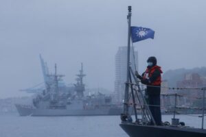 A staff works on a Taiwanese Kuang Hua VI-class missile boat at the port in Keelung, Taiwan April 7, 2023. REUTERS/Ann Wang