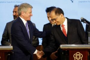 Michael McCaul, Chairman of the U.S. House Foreign Affairs Committee, who is leading a delegation of US lawmakers visiting Taiwan, and Taiwan’s Parliament Speaker You Si-kun, shake hands during a news conference at the parliament in Taipei, Taiwan April 7, 2023. REUTERS/Carlos Garcia Rawlins
