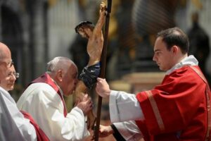 Foto del viernes del Papa Francisco liderando el servicio de Viernes Santo en la Basílica de San Pedro
