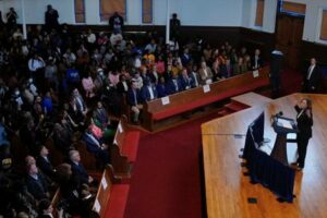 U.S. Vice President Kamala Harris speaks during an address after the Tennessee House of Representatives voted to expel two Democratic members, representatives Justin Pearson and Justin Jones, for their roles in a gun control demonstration at the Tennessee State Capitol, in Nashville, Tennessee, U.S., April 7, 2023. REUTERS/Cheney Orr