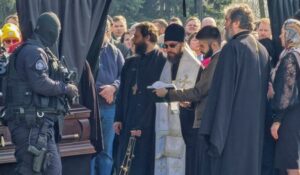 People attend a service before the funeral of Russian military blogger Maxim Fomin widely known by the name of Vladlen Tatarsky, who was recently killed in a bomb attack in a St Petersburg cafe, in Moscow, Russia, April 8, 2023. REUTERS/Stringer