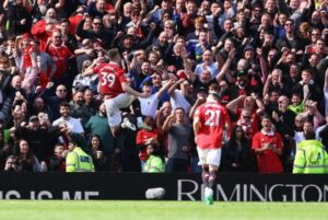 Soccer Football – Premier League – Manchester United v Everton – Old Trafford, Manchester, Britain – April 8, 2023 Manchester United’s Scott McTominay celebrates scoring their first goal REUTERS/Carl Recine
