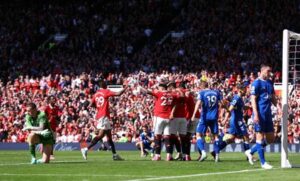 Soccer Football – Premier League – Manchester United v Everton – Old Trafford, Manchester, Britain – April 8, 2023 Manchester United’s Anthony Martial celebrates scoring their second goal with teammates REUTERS/Carl Recine