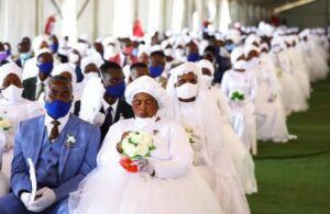 Una novia y un novio esperan durante la ceremonia de boda masiva del Domingo de Pascua, organizada por la Iglesia Internacional Pentecostal de Santidad Ciudad de Jerusalén (IPHC), en la que participan más de 800 parejas, en Kgabalatsane, en la provincia del Noroeste, Sudáfrica. 9 de abril, 2023. REUTERS/Siphiwe Sibeko