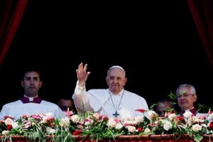 El Papa Francisco saluda desde un balcón el día de su mensaje “Urbi et Orbi” (“A la ciudad y al mundo”) en la Plaza de San Pedro, el Domingo de Pascua, en el Vaticano. 9 de abril, 2023. REUTERS/Yara Nardi