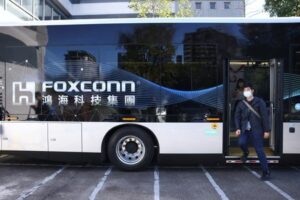 FILE PHOTO: A man walks out from a Foxtron Model T eBus during an organized media visit to Foxconn’s headquarters, in New Taipei City, Taiwan December 22, 2022. REUTERS/Annabelle Chih