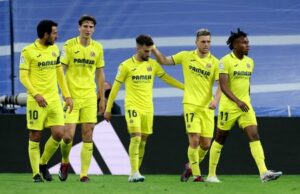 FOTO DE ARCHIVO. Fútbol – LaLiga – Real Madrid v Villarreal – Santiago Bernabeu, Madrid, España – 8 de abril de 2023 – Jugadores del Villarreal celebran el primer gol de su equipo. REUTERS/Isabel Infantes
